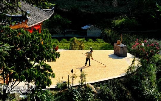 8月22日,湖北省宣恩縣水田壩村農(nóng)民張福云在吊腳樓前翻動(dòng)晾曬的玉米。