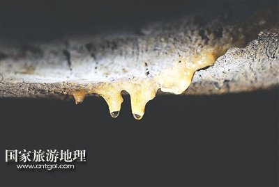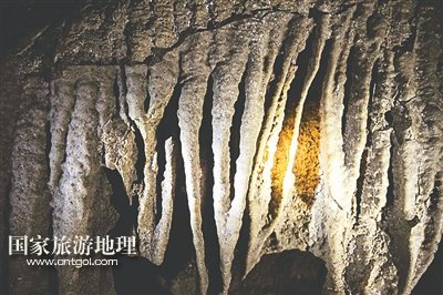 離開(kāi)前洞,順路蜿蜒3公里至后洞,洞口依舊狹小,僅能1人由吊繩垂入約2米著地,斜向下行約5米,石鐘乳洞豁然開(kāi)朗,約500米見(jiàn)方,地面較為平坦,前壁有一紅色“龍形”圖案,頭頂石壁還有一匐匍向前的倒掛石龜,其旁掛著一串“葡萄”狀鐘乳石……