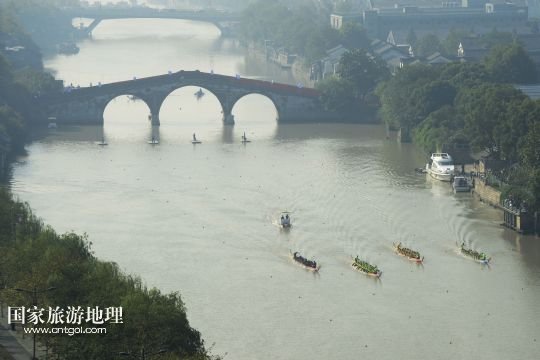 國(guó)家旅游地理 浙江杭州11月9日訊 11月9日,參加500米直道競(jìng)速賽的龍舟隊(duì)從運(yùn)河拱宸橋畔出發(fā)。當(dāng)日,2013年中國(guó)龍舟公開賽年度總決賽(杭州站)在京杭大運(yùn)河杭州拱宸橋段舉行。 /新華社發(fā)(李忠 攝)
