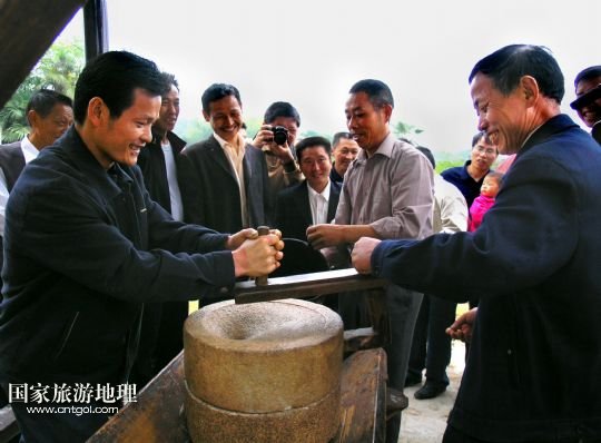 4月28日,游客在江西省靖安縣雙溪鎮(zhèn)大橋村體驗農家推石磨。