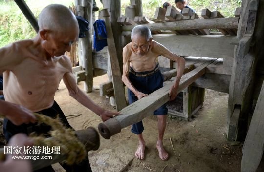 國家旅游地理 湖北恩施6月23日訊 6月21日,在湖北省宣恩縣箭竹坪村的榨油房里,“打榨佬”們揮舞撞錘猛擊楔子。紀(jì)錄片《舌尖上的中國》第二季熱播,讓片子中出現(xiàn)的手工榨油技藝進入公眾的視野。在湖北西部山區(qū)恩施土家族苗族自治州宣恩縣李家河鄉(xiāng)箭竹坪村,依然留存有手工榨油的榨房及一批身懷絕技的手藝人。