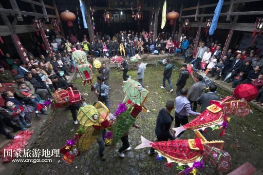 國家旅游地理 浙江麗水11月10日訊 11月8日,浙江景寧畬族自治縣九龍鄉(xiāng)嶺里村的村民在徐氏宗祠內(nèi)表演傳統(tǒng)非遺節(jié)目——魚燈。當(dāng)日,浙江省麗水市景寧畬族自治縣“中國畬鄉(xiāng)魚燈藝術(shù)村展示非遺之美·慶祝豐年活動”在九龍鄉(xiāng)嶺里村舉行。嶺里村自古有在節(jié)日里舞魚燈的習(xí)俗,寄托著人們期望生活吉祥如意、連年有余的美好愿望。 新華社發(fā)(李肅人 攝)