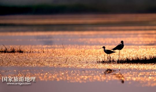 晚霞下,一對(duì)鳥(niǎo)兒相約黃昏后(6月17日攝)。在糧倉(cāng)的西邊,有占地7000余畝的朝邑濕地,這里不僅是鳥(niǎo)的天堂,也吸引了大批游人游覽。