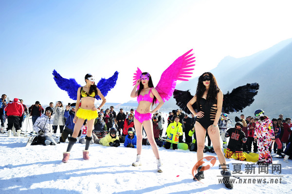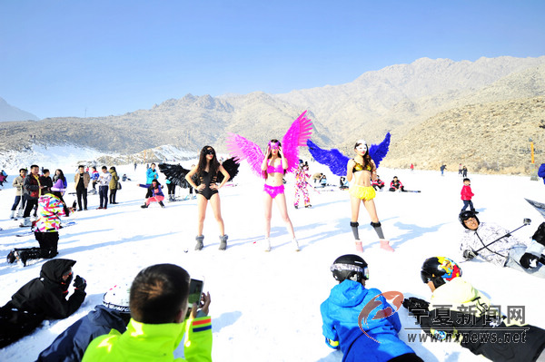 2016年1月1日,新年第一天,在銀川蘇峪口國家森林公園滑雪場,幾位身著色彩艷麗比基尼美女在雪中秀身材并展示瑜伽技巧,吸引了眾多滑雪愛好者的目光。當日,蘇峪口滑雪場前來滑雪的人達數千人。 寧夏新聞網記者 祁瀛濤 攝