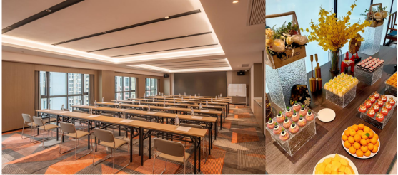 酒店亦深諳商旅人士的需求,配備多功能會議室與超大電子屏等設(shè)施,可靈活組合為課桌式、劇院式等多種布局,最多容納90人。根據(jù)會議節(jié)奏提供的精致茶歇,于細(xì)節(jié)處調(diào)和著商務(wù)的嚴(yán)謹(jǐn)與休憩的從容。